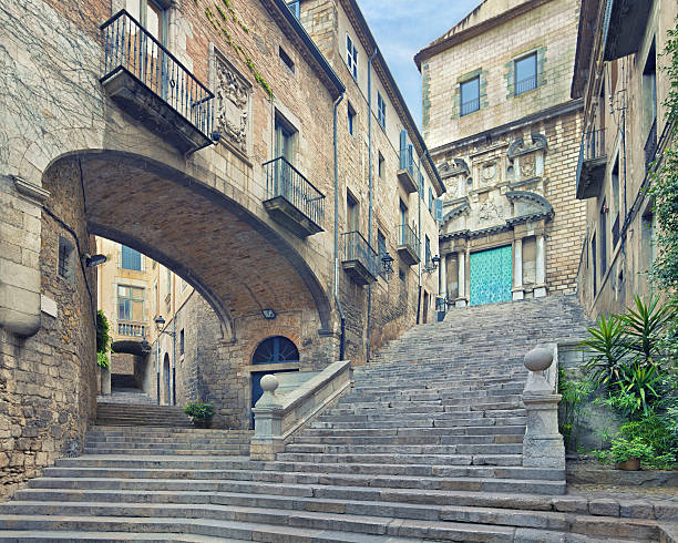 Modern-day Girona. Joyce’s painting shows the view through the archway to the left; the stairs to the right lead to the green doors of the Sant Marti convent