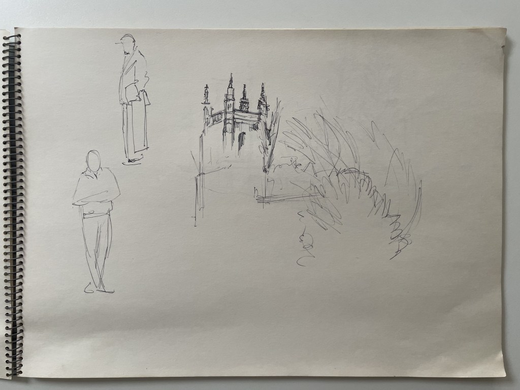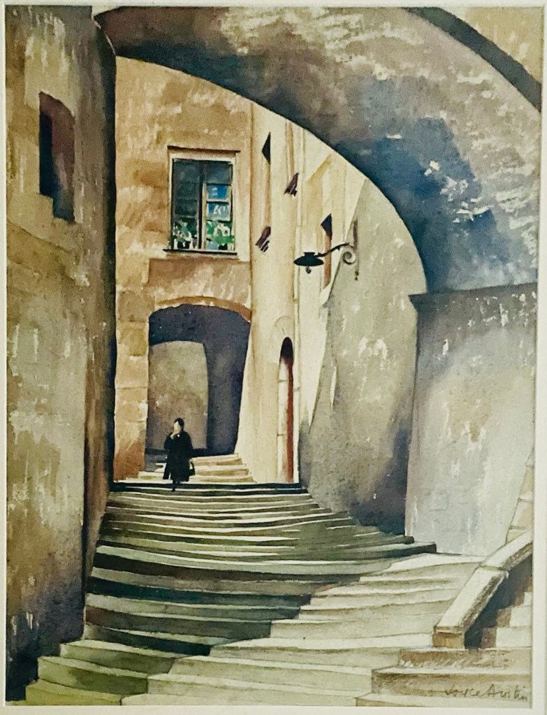 In fact, and typically for Joyce, the view she chose in one of Girona’s now most well-known locations is not the obvious one. You can see a nod to the alternative view in the bottom right hand corner of the painting – a low balustrade and few steps of another staircase leading off to the side. This staircase, leading directly up to the front door of the Sant Marti convent, would appear to be a more eye-catching sight and perhaps a more obvious subject for a painting.