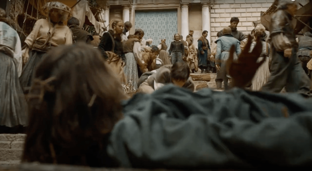 Still from the start of the chase scene in episode six, season eight of Game of Thrones, looking up the steps to the green doors of the Sant Marti convent