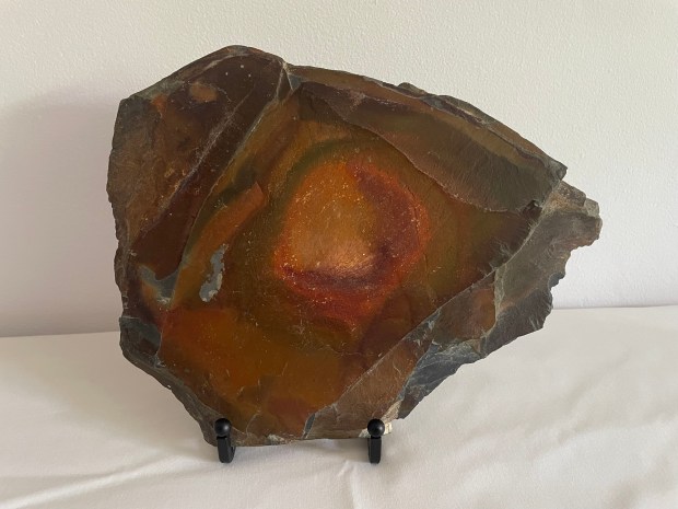 The central stone depicted in this 1975 was collected by Joyce, and remains with the painting in the family collectionJoyce’s eye was certainly caught by this rock. It’s thought to be slate with its distinctive top layer formed by an oxidized iron mineral layer (thanks for this identification to Reddit contributor /CrossP). It was collected by Joyce and featured in the painting above.Poem by Joyce Austin, illustration by Katie Smallbone